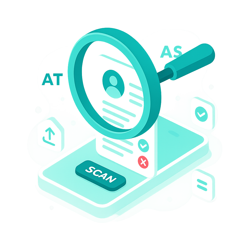 Our engine reads your résumé the way applicant tracking systems do. It identifies sections, normalizes titles and dates, detects skills and keywords, and estimates how you would surface in recruiter searches.