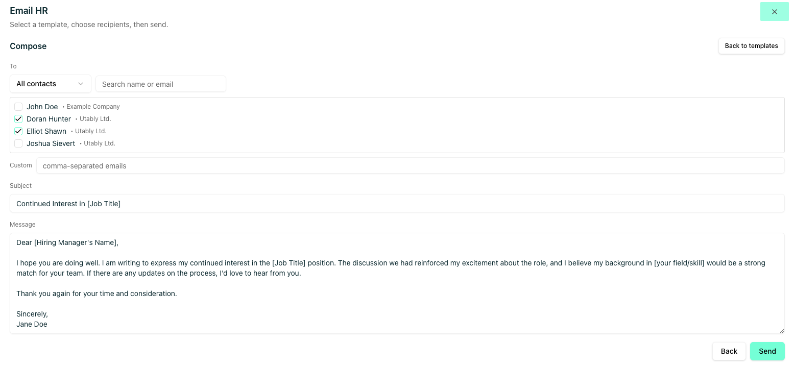 Pick the right people, drop in a prefilled message, and send with confidence. Everything pulls from your application and contact data so you spend less time writing and more time moving the process forward.