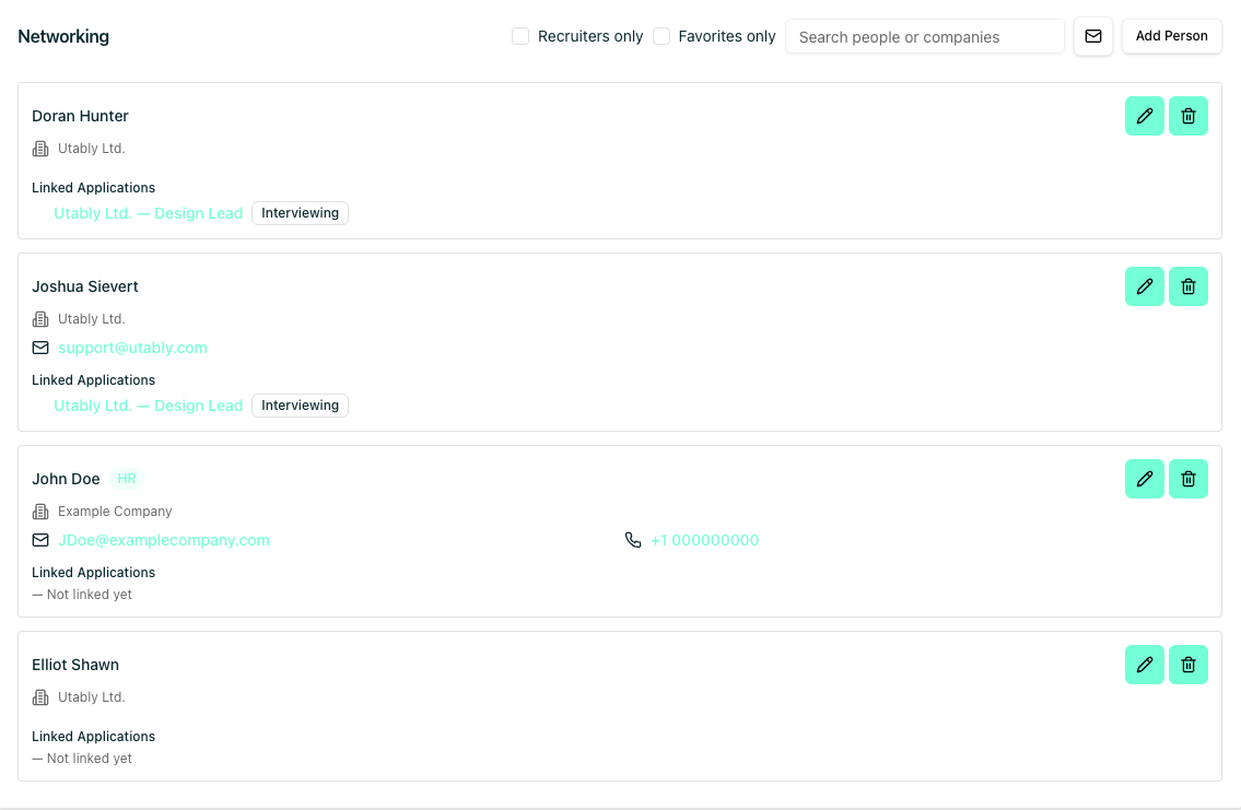 Add a person once and Utably links them to the right applications and interview rounds. @mention a name in your notes and we attach the note to that contact automatically. No need for endless note checking. See who said what, follow up in seconds, and keep everything in one clean view.