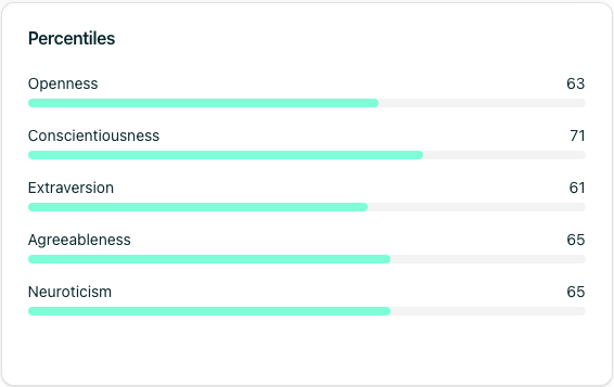 Agreeableness is your collaboration style. It colors how you read the room, resolve tension, and build trust. Higher scores influence through empathy and alignment; lower scores move teams forward with crisp candor and decisive trade-offs. We reflect this in your story, either emphasising partnership and enablement, or clear choices and results.